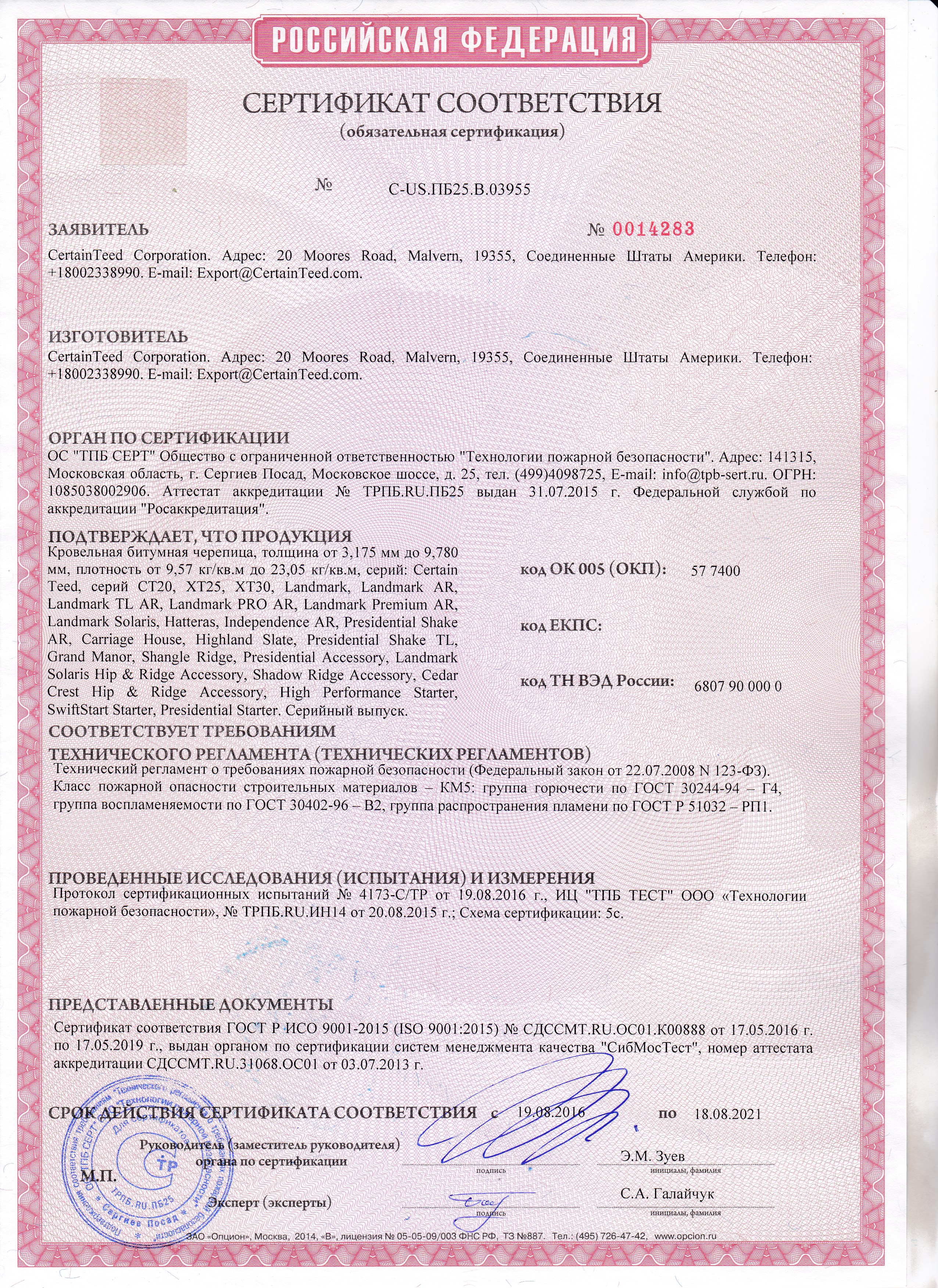 Подтвержденное сертификатами и действующими ГОСТ